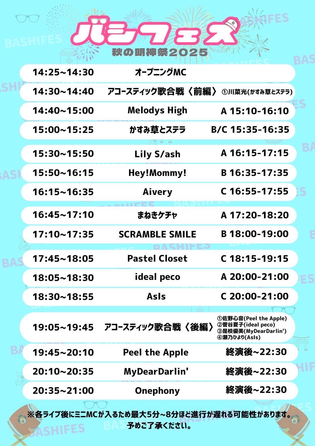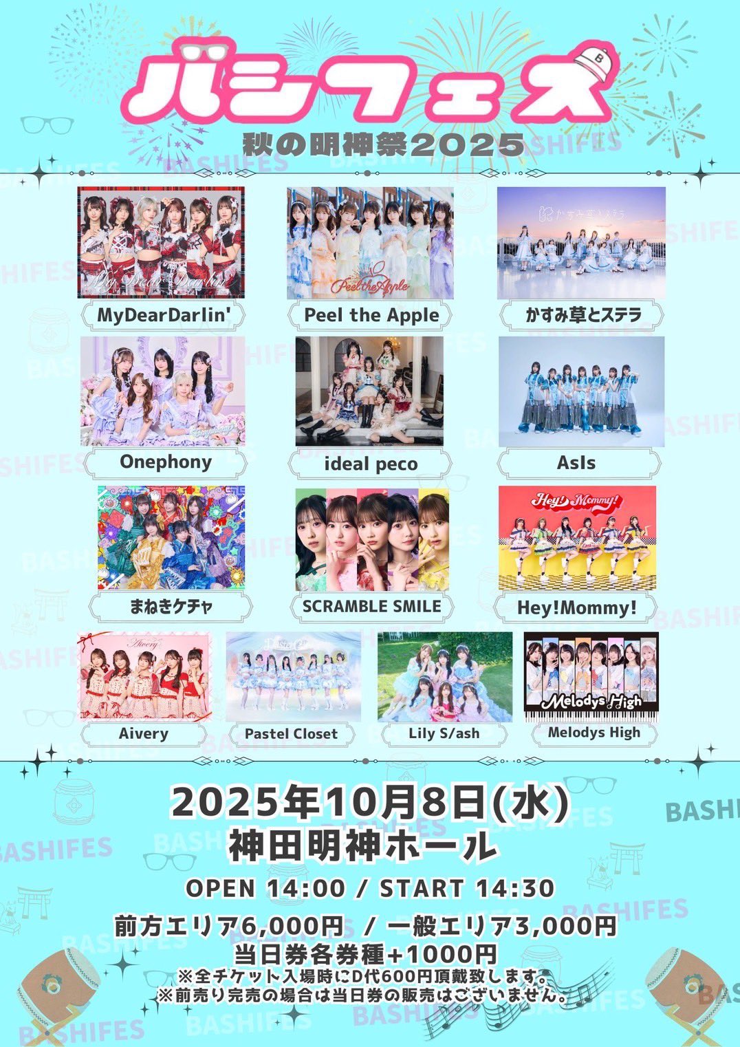 バシフェス秋の明神祭2025 日程:2025年10月8日(水) 会場名:神田明神ホール URL:https://ticketdive.com/event/Bashifes2025 【時間】 【ライブ】18:30-18:55 【歌合戦】19:05-19:45💛瀬乃ひより 【特典会】20:00-21:00(C) 【チケット】前方6,000円 一般3,000円 当日各1,000円UP (各1D別)