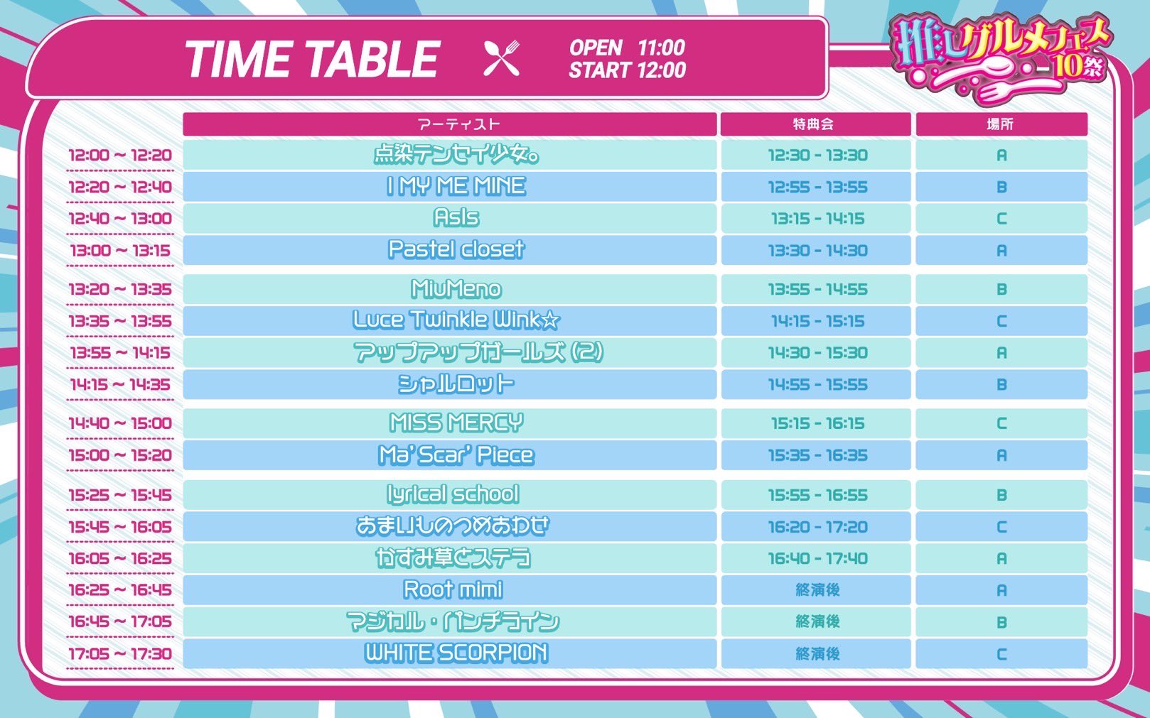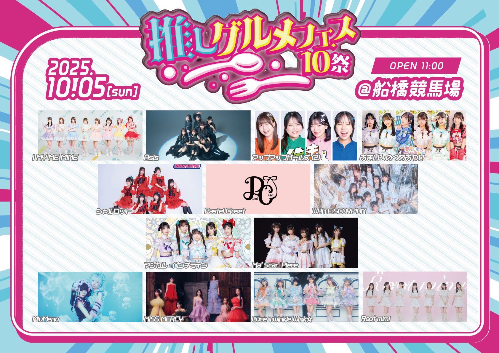 ①推しグルメフェス 日程:2025年10月5日(日) 会場名:船橋競馬場 URL:https://www.ticketpay.jp/search/?keyword=%E6%8E%A8%E3%81%97%E3%82%B0%E3%83%AB%E3%83%A1%E3%83%95%E3%82%A7%E3%82%B910%E7%A5%AD 【時間】OPEN 11:00 / START 12:00 【ライブ】12:40-13:00 【特典会】13:15-14:15(C) 【チケット】前⽅VIP 10,000円/⼀般 4,500円/U-18学割 3,000円