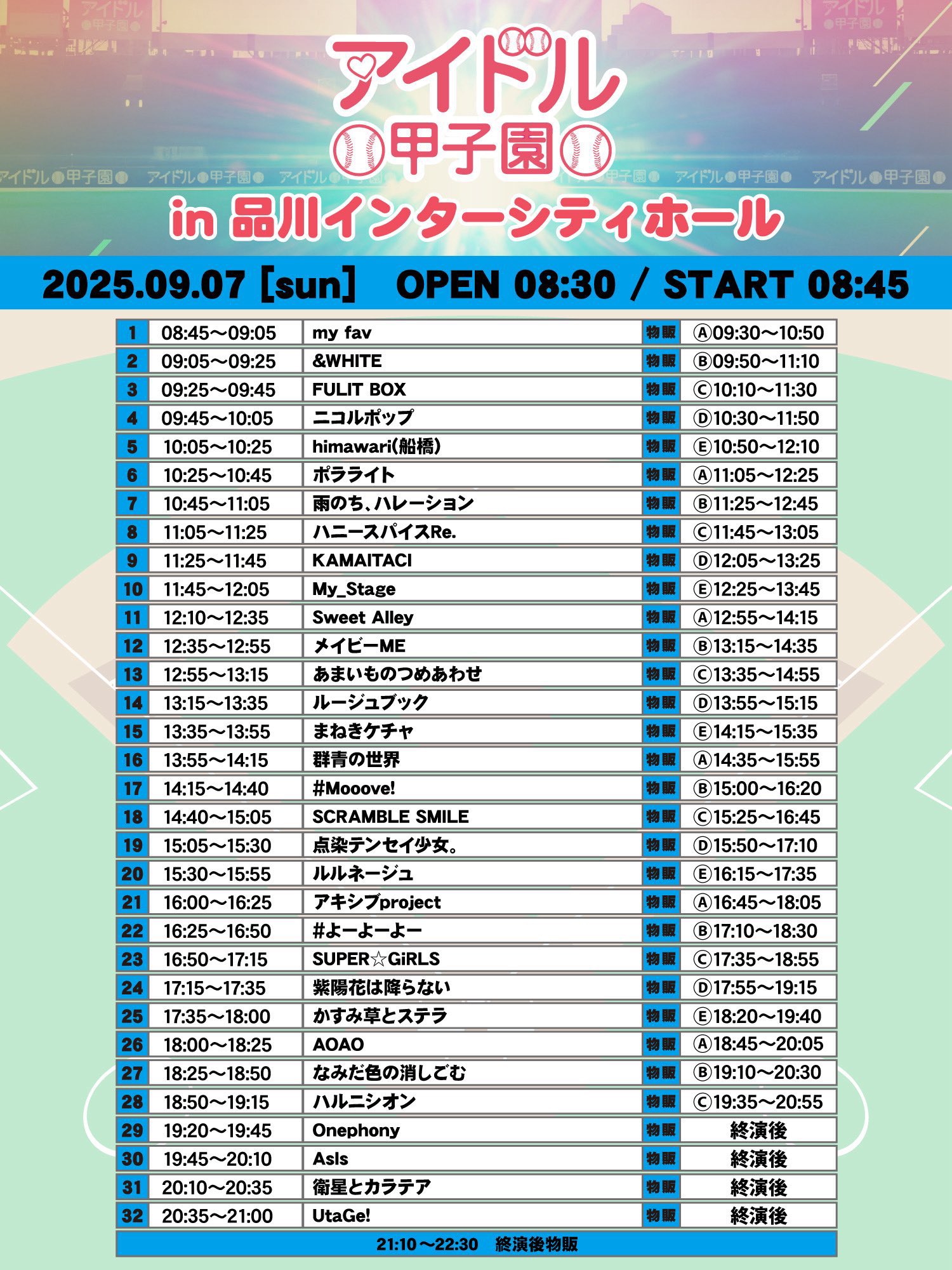 アイドル甲子園 in 品川インターシティホール 日程:2025年9月7日(日) 会場名:品川インターシティホール URL:https://t.livepocket.jp/e/idolkoushien_0907 【時間】OPEN 8:30 / START 8:45 【ライブ】19:45-20:10 【特典会】21:10-22:30 📸一部撮影可能📸 【チケット】前方エリア¥9,000/一般¥4,500(各+1D)