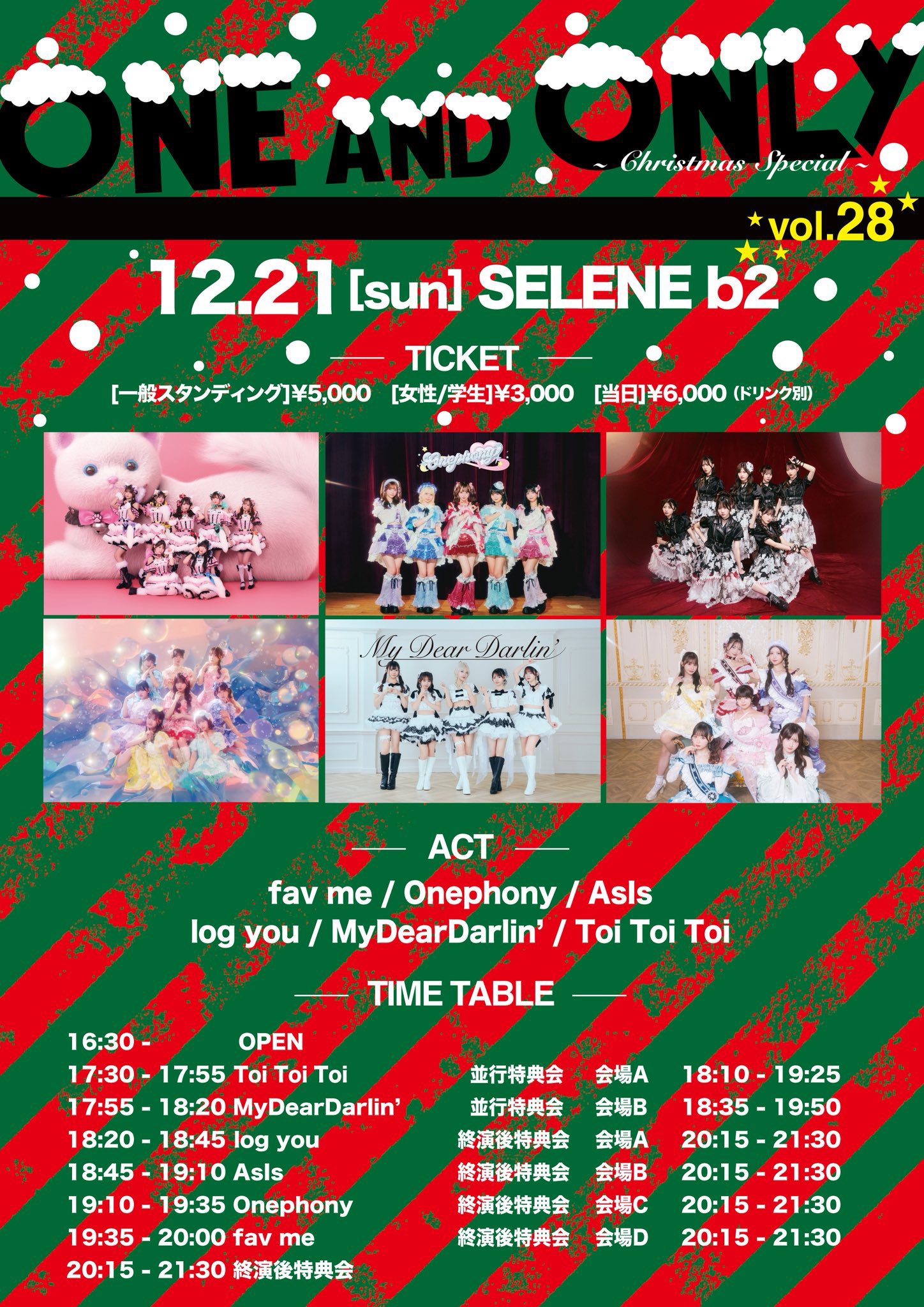 ONE AND ONLY Vol.28 〜 Christmas Special 〜 日程:2025年12月21日(日) 会場名:白金高輪SELENE b2 URL:https://l-tike.com/concert/mevent/?mid=732837 【時間】OPEN16:30/START17:30 【ライブ】18:45-19:10 【特典会】20:15-21:30 ※終演後物販 【チケット】一般スタンディング 5,000円/学生,女性 3,000円 ◼︎プレリクエスト抽選先行:11月19日 20:00-12月7日 23:59 ◼︎一般販売:12月12日 20:00