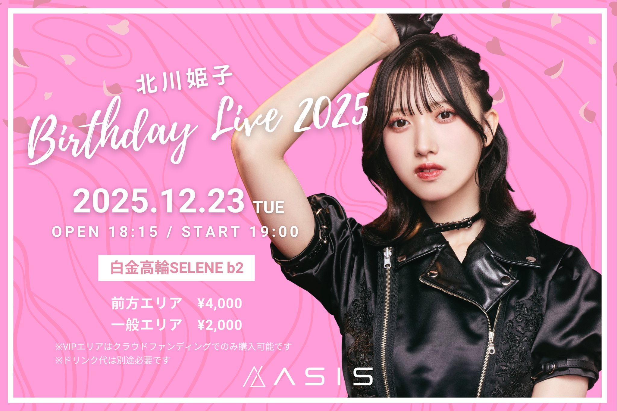 北川姫子生誕祭 単独公演 日程:2025年12月23日(火) 会場名:白金高輪SELENE b2 URL:https://ticketdive.com/event/HIMEKO_251223 【時間】OPEN 18:15 / START 19:00 【チケット】前方エリア 4,000円 / 一般エリア 2,000円 / 当日券+1,000円 (別途各1drink) ※VIPエリアはクラウドファンディング限定です 北川姫子人生初の単独生誕祭、みんなでお祝いしましょう👑🩷