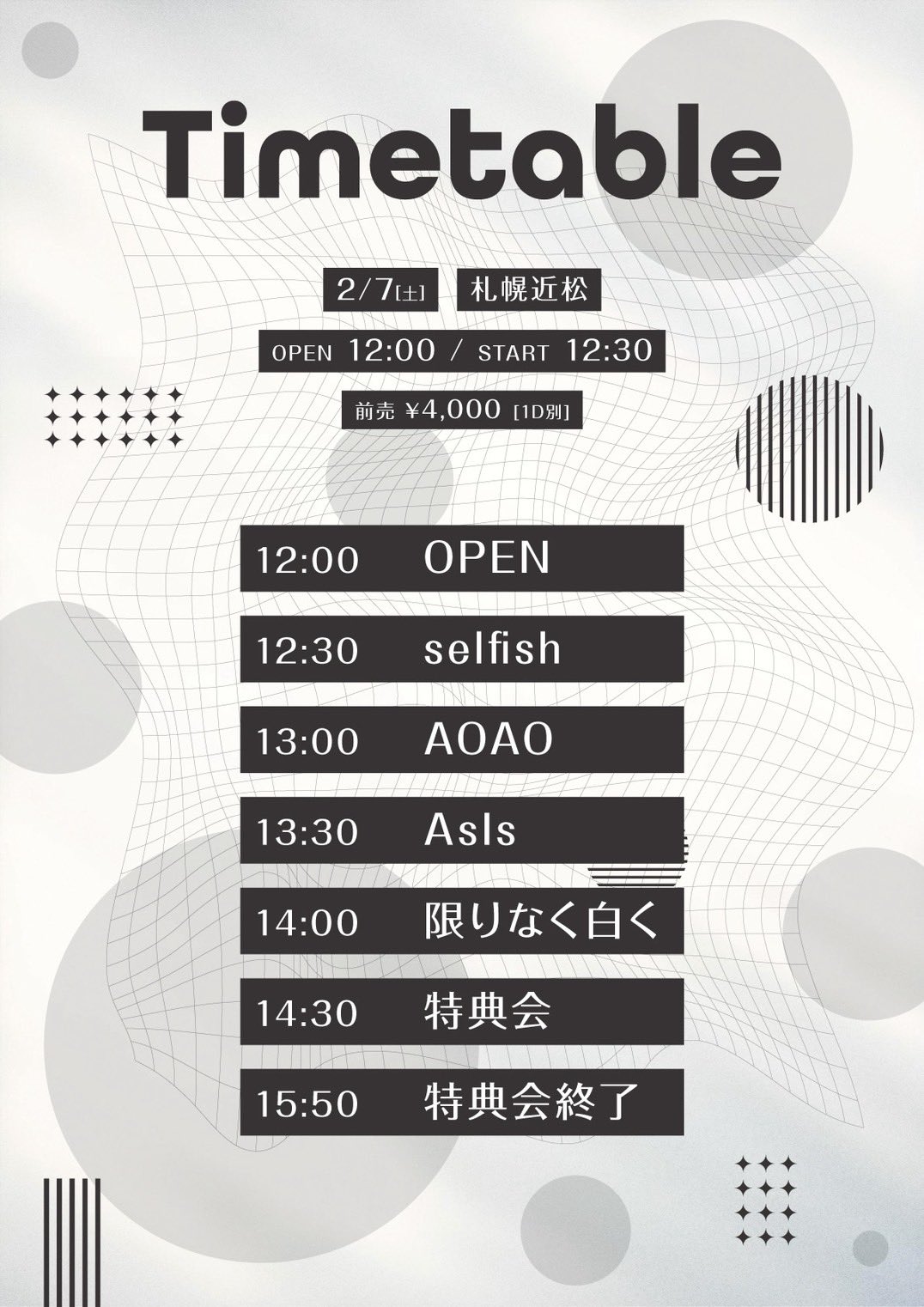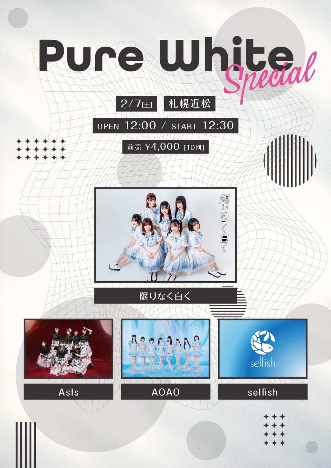 限りなく白く主催ライブ『Pure White Special』 日程:2026年2月7日(土) 会場名:札幌近松 URL:https://ticketdive.com/event/purewhite_special 【時間】OPEN12:00/START12:30 【ライブ】13:30-14:00 【特典会】14:30-15:50 【チケット】前売り4,000円※1dr別途