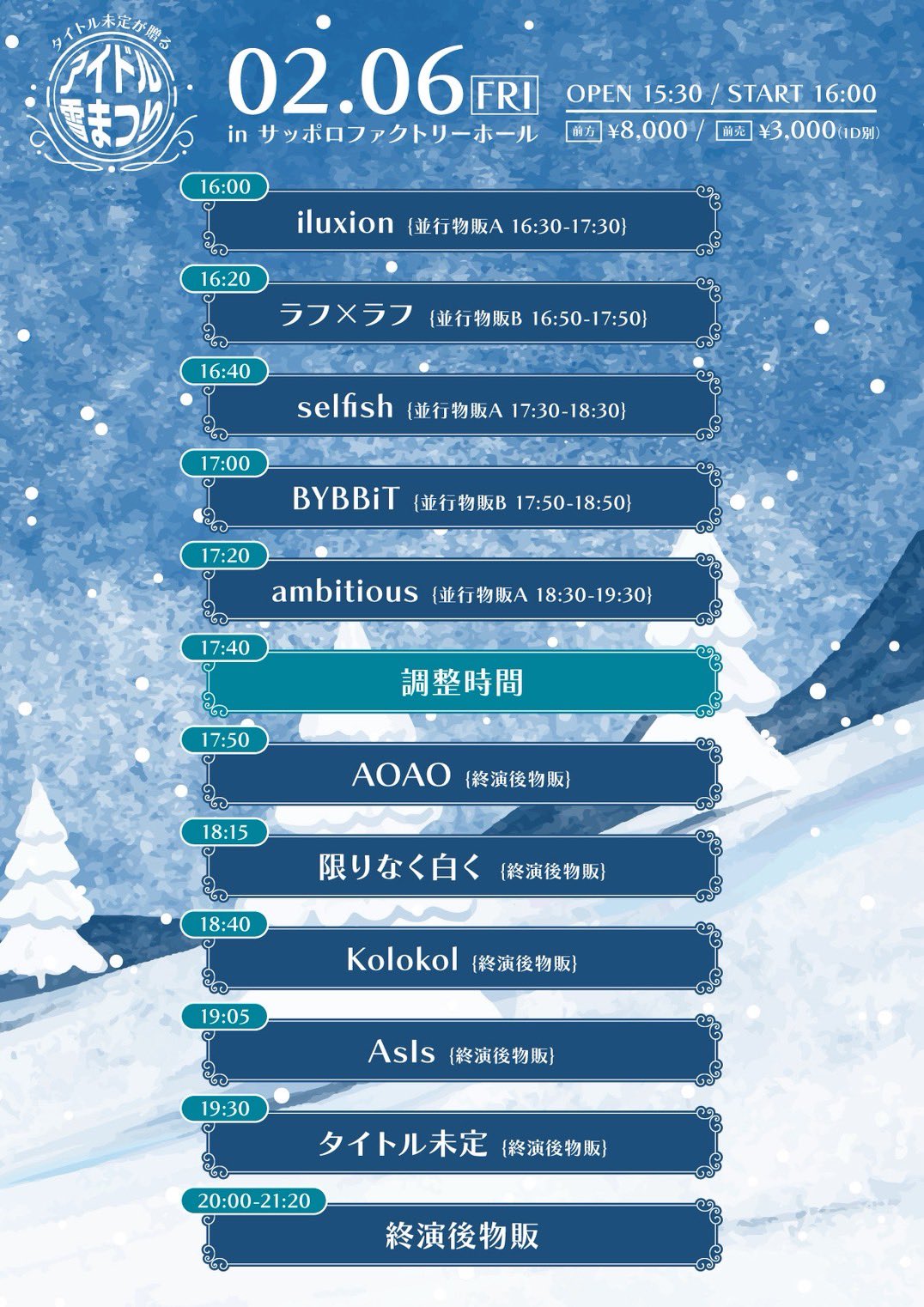 アイドル雪まつり 日程:2026年2月6日(金) 会場名:サッポロファクトリーホール URL:https://ticketdive.com/event/yuki_matsuri 【時間】OPEN15:30/START16:00 【ライブ】19:05-19:30 【特典会】20:00-21:20 【チケット】前方8,000円/前売り3,000円 ❄️北海道遠征1日目❄️ タイトル未定が贈る『アイドル雪まつり』 in サッポロファクトリーホール。 北海道遠征初日はトリ前を努めます✊❤️🔥
