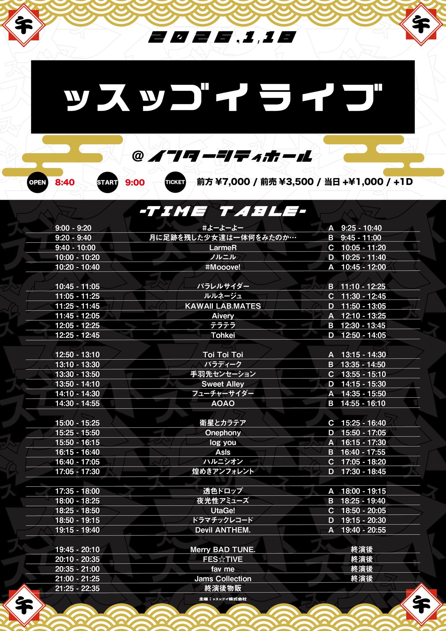 ッスッゴイライブ 日程:2026年1月18日(日) 会場名:品川インターシティホール URL:https://ticketdive.com/event/ssuggoi_0118 【時間】OPEN9:30/START9:50 【ライブ】16:15-16:40 【特典会】16:40-17:55(B) 【チケット】前売り3,500円/前方7,000円/当日各+1,000円(D代別)