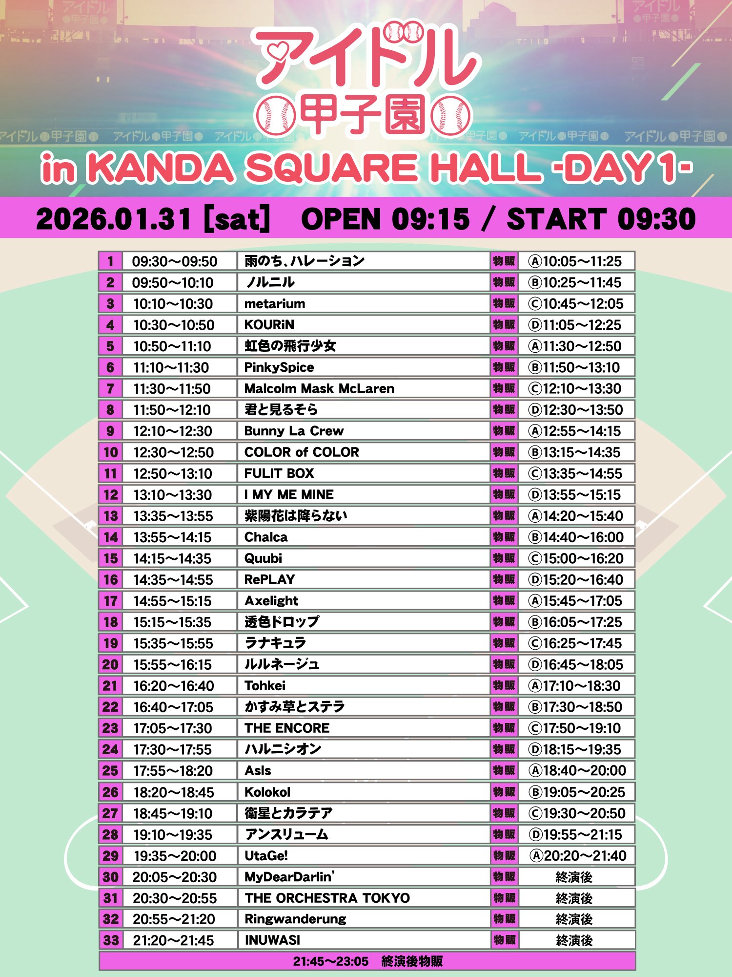 アイドル甲子園 in KANDA SQUARE HALL-DAY1- 日程:2026年1月31日(土) 会場名:KANDA SQUARE HALL URL:https://livepocket.jp/e/aikou_0131 【時間】OPEN9:15/START9:30 【ライブ】17:55-18:20 【特典会】18:40-20:00(A) 【チケット】前方8,500円/一般3,500円(1dr別途)