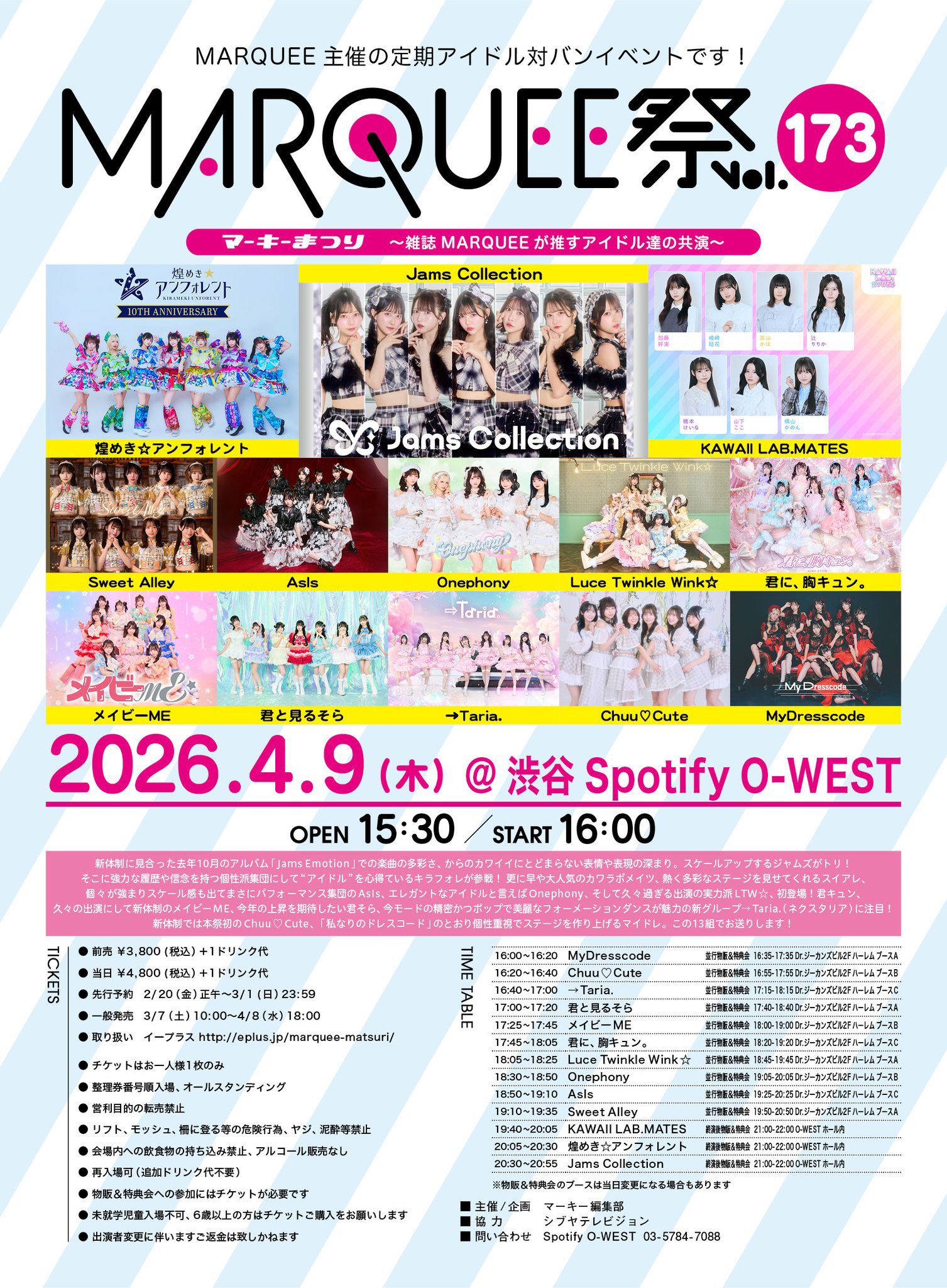 MARQUEE祭 Vol.173 日程:2026年4月9日(木) 会場名:Spotify O-WEST URL:https://eplus.jp/sf/word/0000131445 【時間】OPEN 15:30/START 16:00 【ライブ】18:50-19:10 【特典会】19:25-20:25 ハーレムブースC 【AsIs指名入場特典】サイン付きチェキ 【チケット】前売¥3800/当日¥4800 (共に+1D) 〜3/1 23:59まで受付