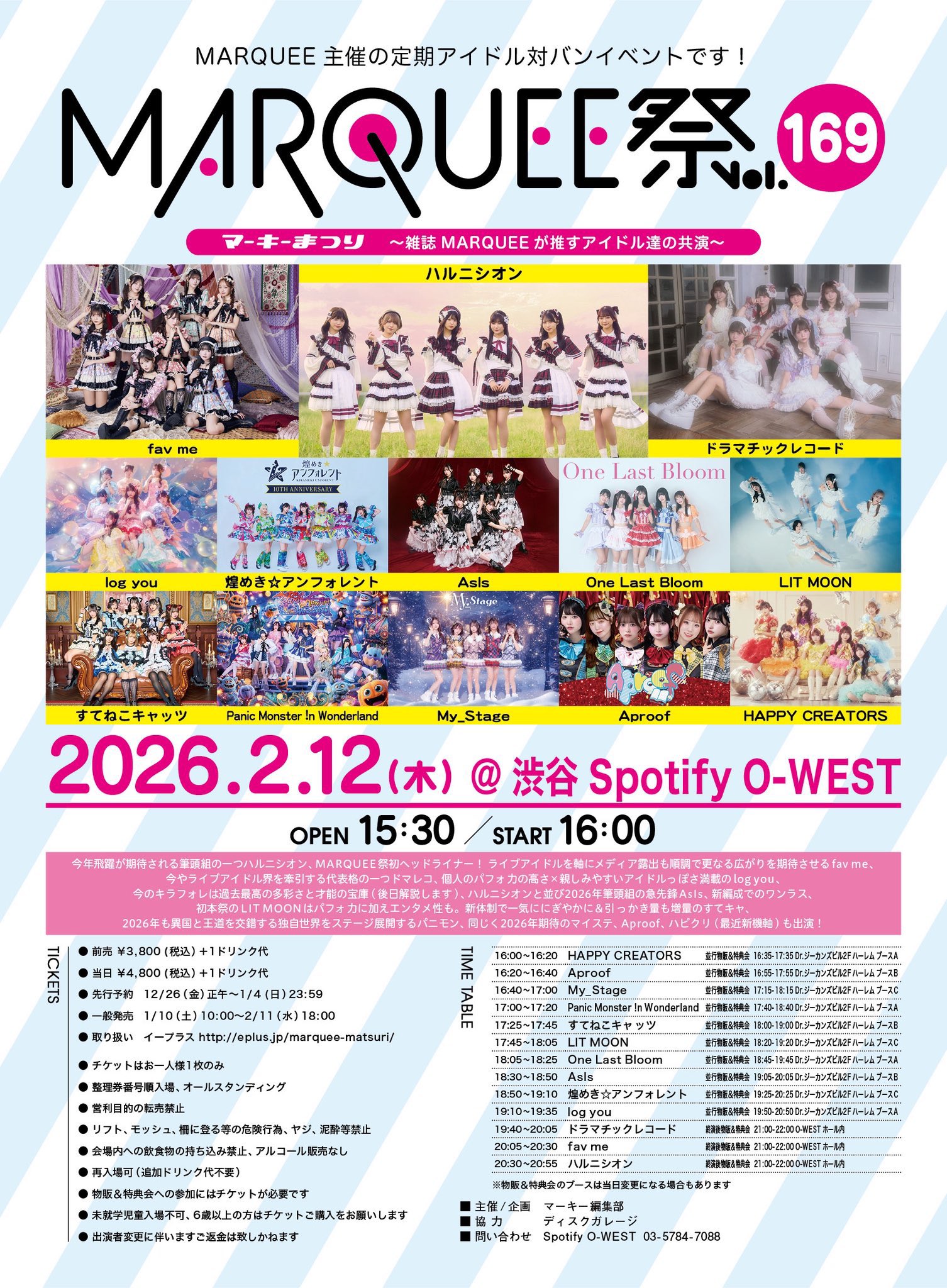 MARQUEE祭 Vol.169 日程:2026年2月12日(木) 会場名:Spotify O-WEST URL:https://eplus.jp/sf/word/0000131445 【時間】OPEN15:30/START16:00 【ライブ】18:30-18:50 【特典会】19:05-20:05(ハーレム2F Bブース) 【チケット】前売¥3800/当日¥4800 (共に+1D) 先行予約 12/26(金)12:00~1/4(日)23:59まで 一般販売(先着) 1/10(土)10:00~2/11(水)18:00まで