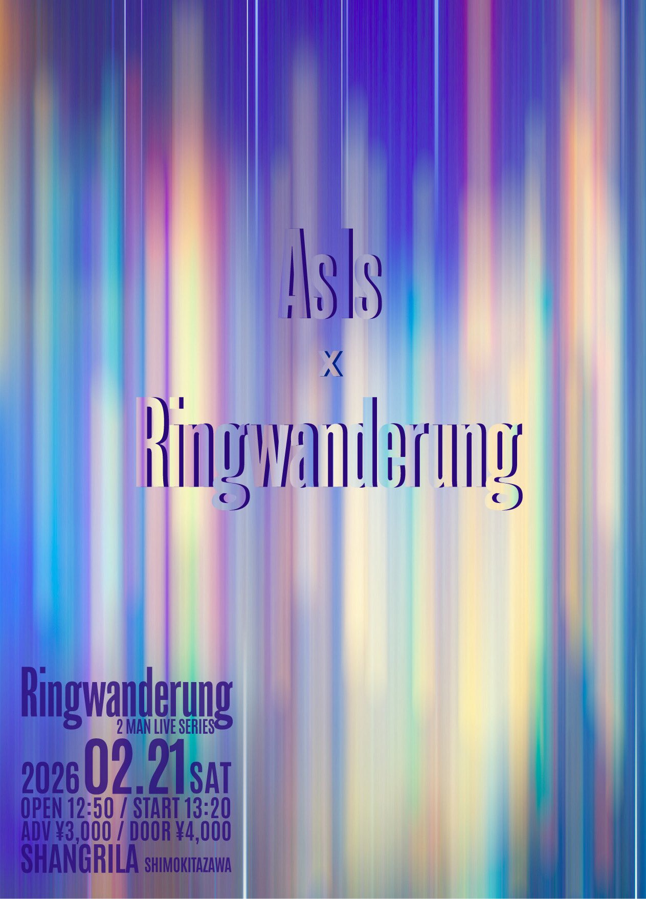 Ringwanderung ✖️AsIs 日程:2026年2月21日(土) 会場名:下北沢シャングリラ URL:https://ticketdive.com/event/rwr_2man_260221 【時間】OPEN12:50/START13:20 【チケット】3,000円(別途1dr制) 一般販売(先着) 1/27(火)21:30〜2/20(金)23:59 Ringwanderungさんの主催公演に出演致します🔥 詳細は追ってお知らせいたします🎶
